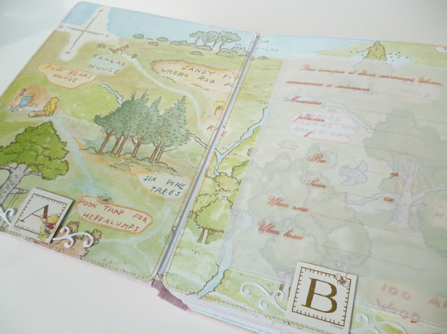 А у меня вместо чисел - буквы )) А вместо виньеток - вырубка )) Вот поэтому 26 страниц, 13 разворотов. Для большего сходства с классическими книжными изданиями "Винни-Пуха" я сделала альбому форзацы из бумаги с картой Стоакрового леса (или Волшебного леса, в русском варианте):